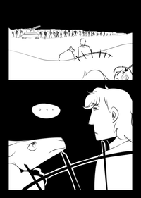 Eggo and Pancho sit grimly in the path of an advancing army. They exchange a sad look with one another.
