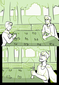 Fin and Basil (the two guys from the cover) stand in the garden together. Fin wears earmuffs, chipping away at some soil with a little trowel. Basil doesn't have ear protection, and is tugging at one of the plants with bare hands.