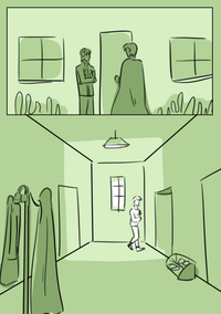 Fin hangs up his coat, and Basil his cloak in the space between panels.