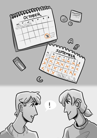 Fin and Basil's fridge is pictured! It's the first of October. The two smile at eachother, Fin excited. Basil wears a hearing aid now.