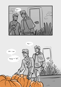 The boys head out, talking amongst themselves as they appraise some pumpkins.
