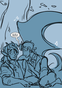 Blue looks very startled, Indigo awkward as Blue practically is sat on him.