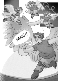 August is also skating, swirling about on his rollerskates, leaning into his motion with wings and arms outstretched.