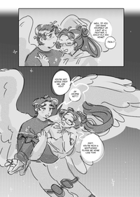 Miles gets all sparkly, presumably because she has magically made herself very light somehow. August princess-carries her through the night sky.