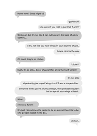 MILES: "it's not silly! id probably give myself wings too if I was a shapeshifter... everyone thinks you're a furry anyways, they probably wouldn't bat an eye at your wings at least..."