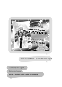 The comic continues in a text messages format. Miles has sent a picture to August, which reads 'Don't kill the part of you that is CRINGE, kill tha part of you that CRINGES. SLAUGHTER IT THAT IT MAY NEVER RETURN.