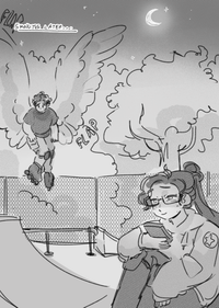 It's 5 minutes later, and August is touching down in the skate park, moon glowing brightly overhead.