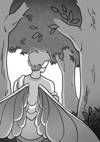 A quiet page as the changeling boy walks through the forest, trees tall and calm.