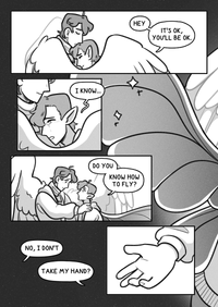 The two hug, the changeling boy pressing his tear-streaked face into the postie's chest, as the postie wraps a reassuring wing around him.