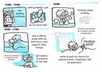 18:00 - thinking about knitting... I found a cool pattern for a jumper but yarn is expensive... (drawing of a cube headed guy pointing and yelling INVOICE SENT!) wrote and sent my invoice for January's work... hopefully I will be paid soon.