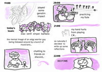 19:00 - played some genshin impact. today's team: xiao, venti, xinyan, barbara (accompanied by tiny drawings of the character's faces from memory). the mental image of an edgy warrior guy being followed round by a bunch of musicians... chatting to friends on discord.