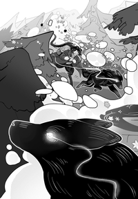 A double-page spread that's been cut in half. Snow suddenly floods the mountain, Paige still fixated on chasing the dog, who seems to lead her away from the crashing snow.
