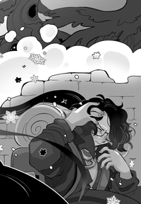 Paige takes cover behind a crumbling wall, snow piling heavily onto it. She winces, bracing herself.