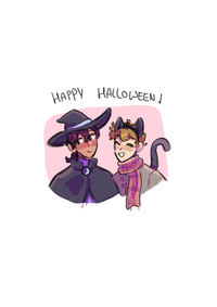 A coloured drawing of Fin and Basil in halloween costumes smiling. Basil wears a witchy outfit (which is arguably just their work clothes), while Fin wears cat ears and a tail.